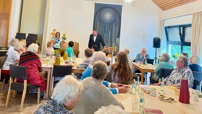 Nach einer kurzen Pause begrüßt Barbara Hölken den heutigen Referenten Landrat Mario Löhr. Herr Löhr stellt sich der Gruppe vor und hält einen kurzen Vortrag zum Thema: „Demokratie gestalten in Kirche und Gesellschaft“. Folgende Aspekt wurden beleuchtet: „Wer entscheidet – nur die Wohlhabenden?“; „Wie können wir andere, nicht so Wohlhabende einbeziehen?“; „Kirche muss weiterhin deutlich Position zu aktuellen Fragen beziehen“. Anschließend konnten die Frauen Fragen stellen und so schloss sich eine angeregte Diskussion an. Passend zum Thema wurde für das Projekt „Stolpersteine“ eine Kollekte zusammengelegt. Der Nachmittag endete mit Gebet und Segen.